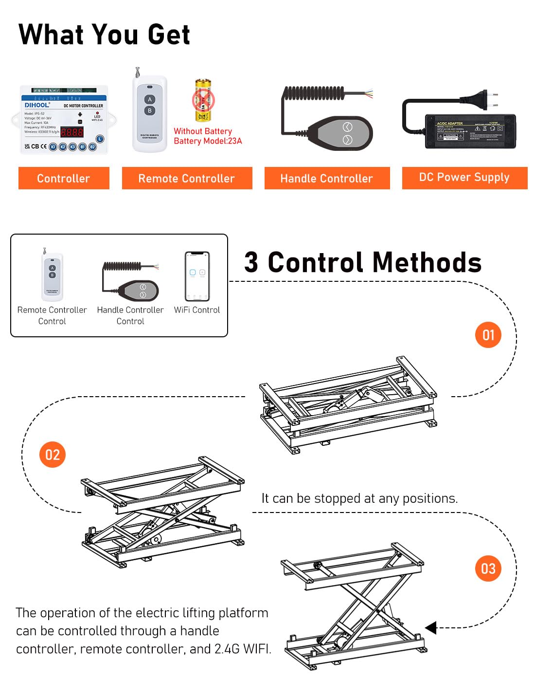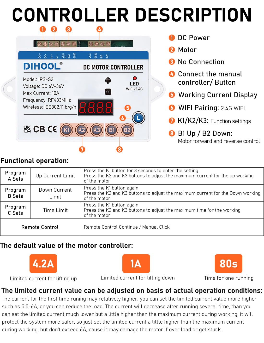 - 【Vier Kontrollmethoden】1.The Taste auf dem IPS-S2 Controller (B1-UP, B2-DOWN) 2.The Verdrahtungsgriff Taste, die Länge bis zu 2.5m 3.The eWelink APP (unten von der APP oder Android Store) 4.Die drahtlose Fernbedienung